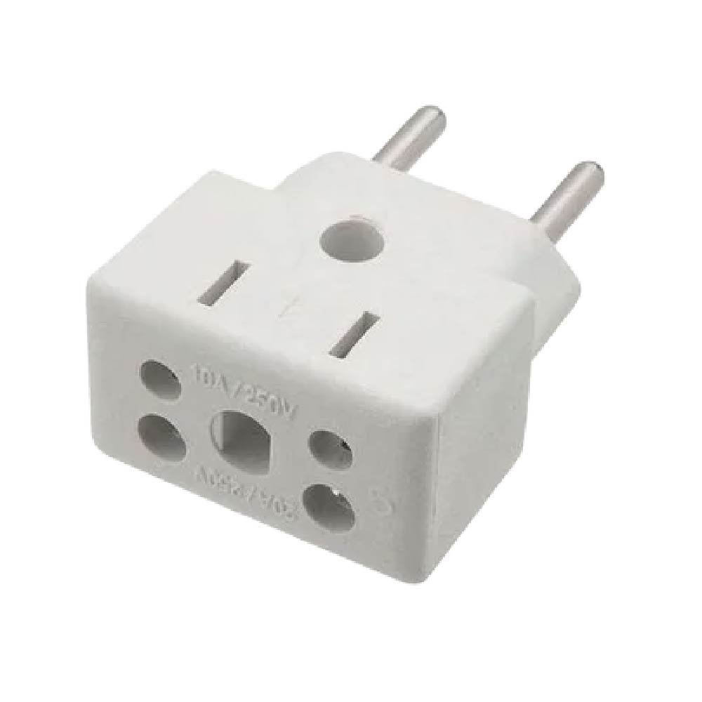 Adaptador possui entrada de 10A e 20A até 250V, com uma entrada fêmea universal que aceita tanto pinos finos de 10A quanto pinos grossos de 20A, além de outros padrões de tomadas.