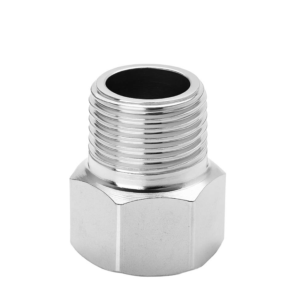 É um adaptador de rosca que permite conectar uma tubulação ou equipamento com rosca de 1/2 polegada a um ponto com rosca de 3/4 de polegada, feita de aço inoxidável com acabamento cromado para maior durabilidade.