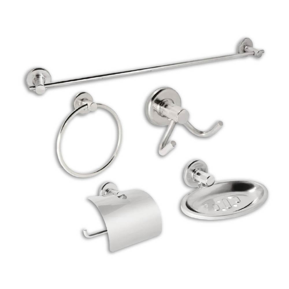 Inclui um porta-toalha de banho, um porta-toalha de rosto (argola), um cabide duplo, uma saboneteira e uma papeleira com tampa.