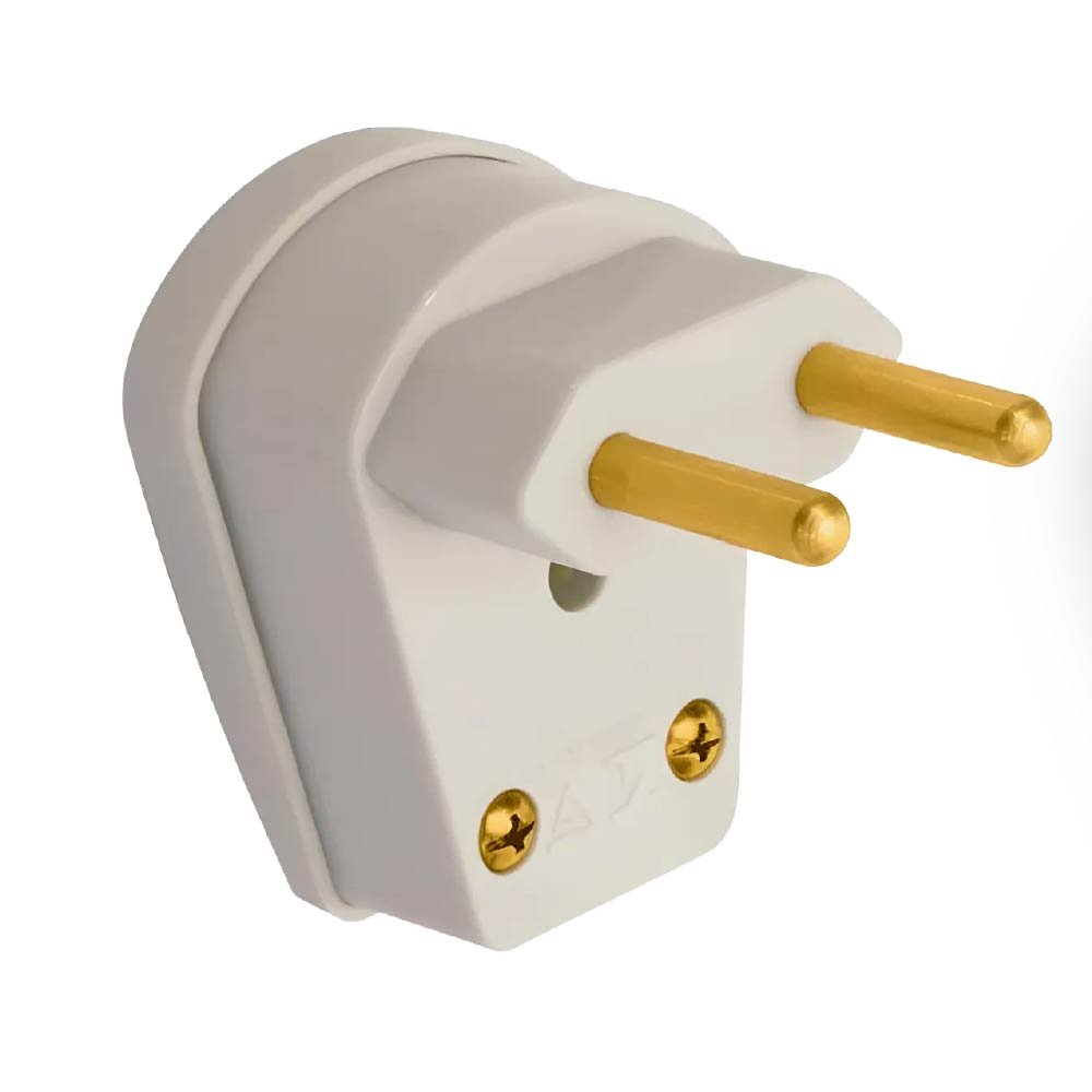 É um conector elétrico projetado para ser conectado a uma tomada ou extensão fêmea, com a particularidade de ter uma entrada para o cabo em um ângulo de 90 graus.