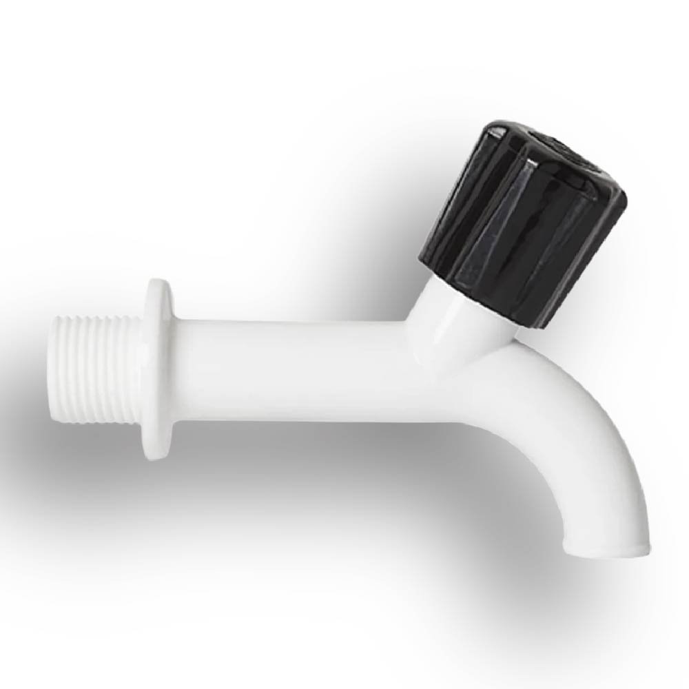 É uma torneira plástica, branca, projetada para instalação em paredes de áreas de serviço e tanques.